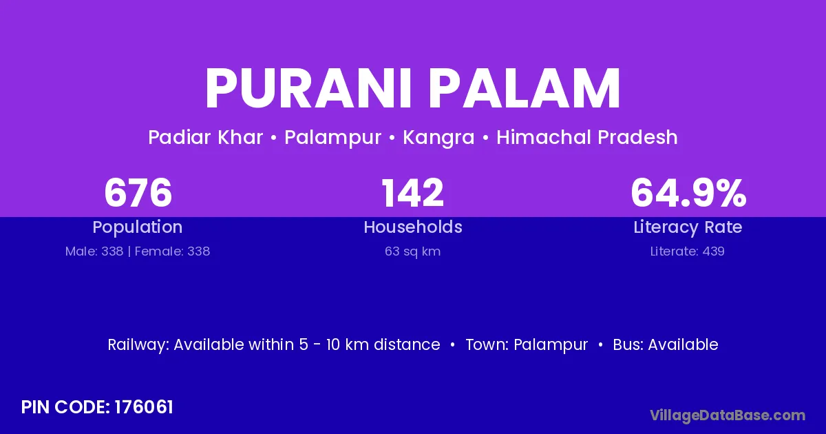 Palampur is the nearest town to Purani Palam village for major economic activities