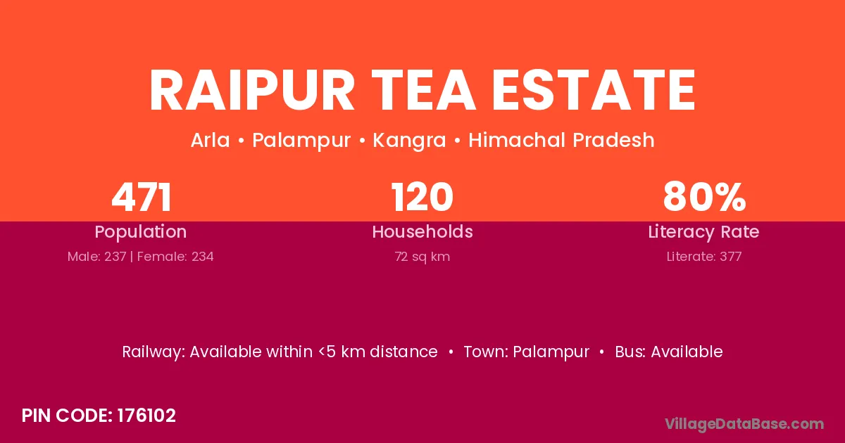 Raipur Tea Estate village has a total population of 471 people, of which 237 are males and 234 are females.