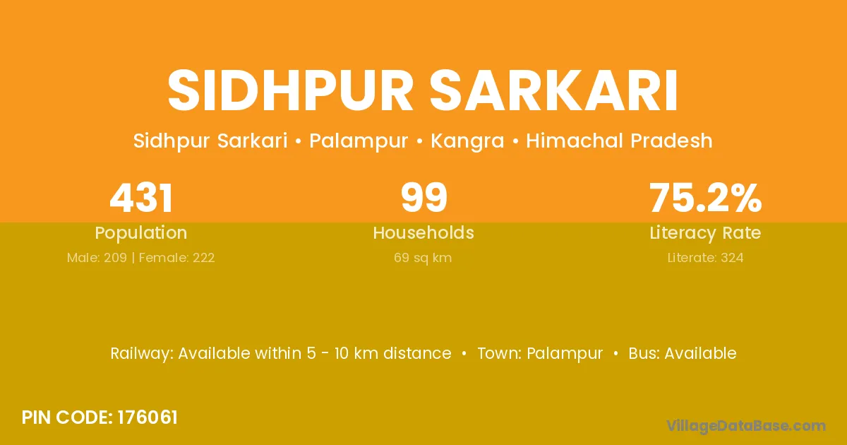 Sidhpur Sarkari village has a total population of 431 people, of which 209 are males and 222 are females.