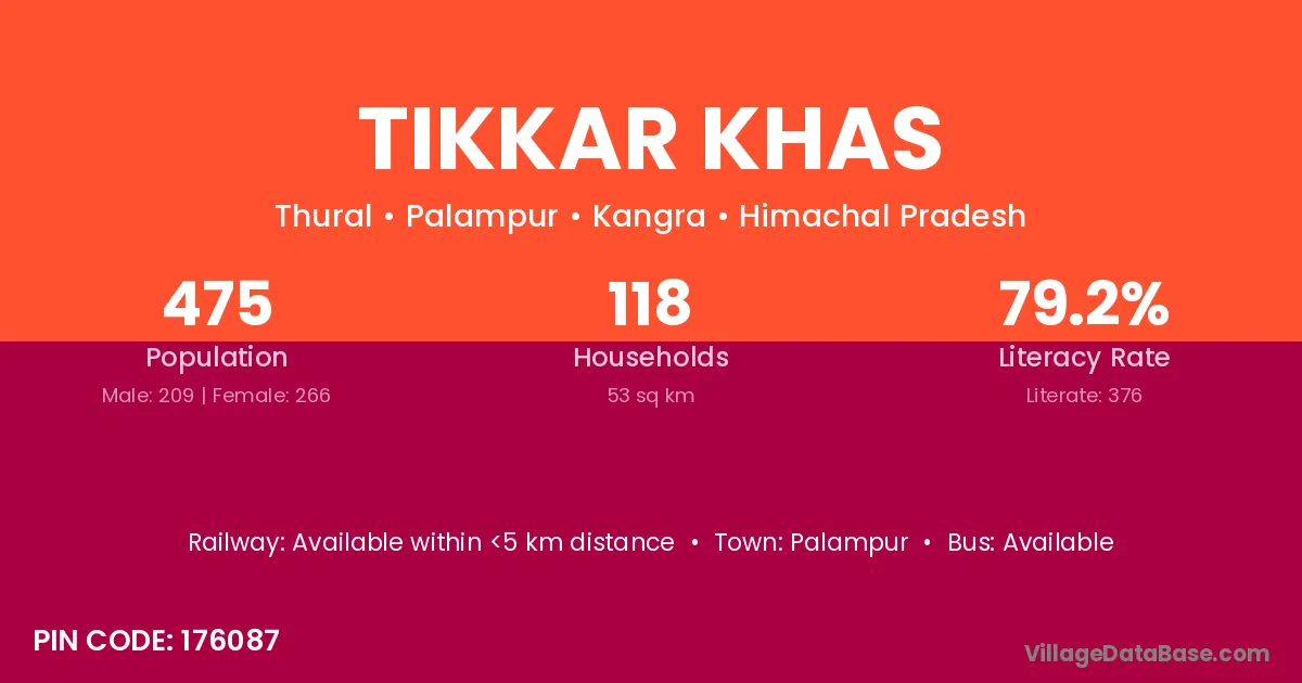 Palampur is the nearest town to Tikkar Khas village for major economic activities