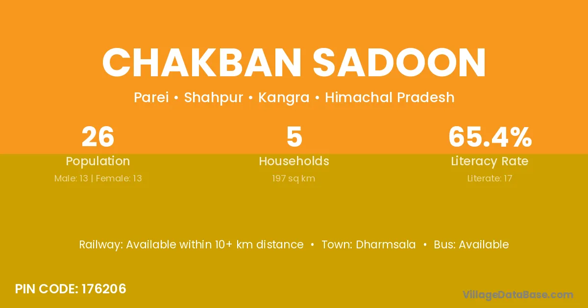 Chakban Sadoon village has a total population of 26 people, of which 13 are males and 13 are females.