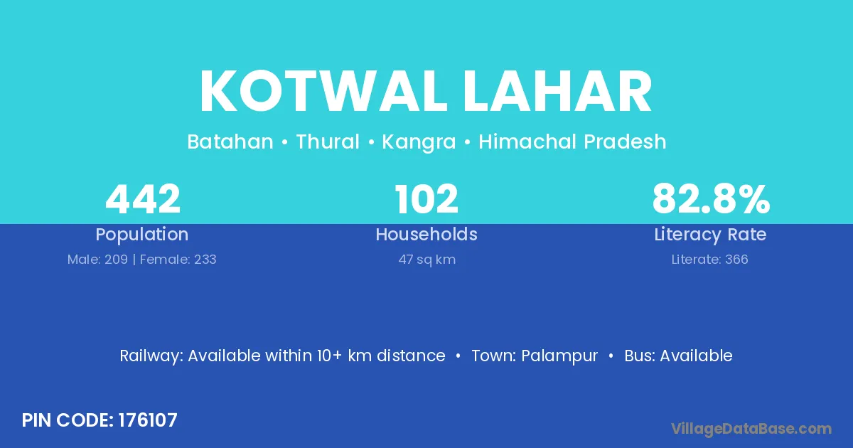 Palampur is the nearest town to Kotwal Lahar village for major economic activities