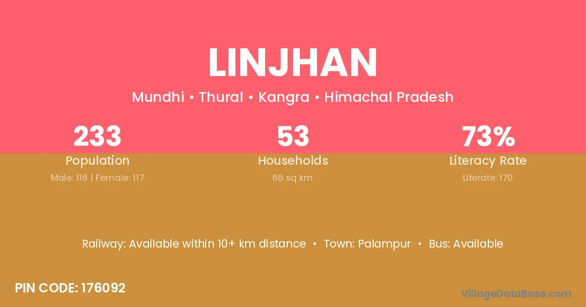 Linjhan village has a total population of 233 people, of which 116 are males and 117 are females.