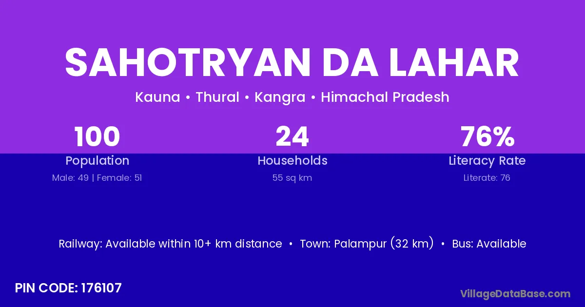 Palampur (32 km) is the nearest town to Sahotryan Da Lahar village for major economic activities and is located approximately 32 km away.