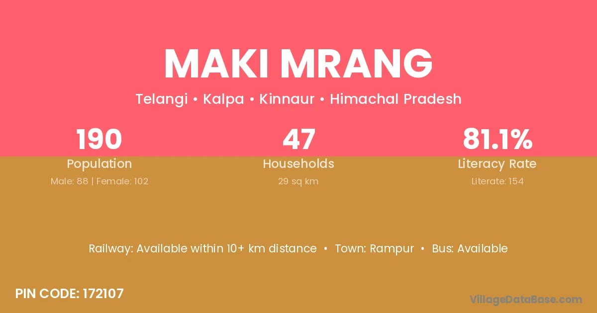 Maki Mrang village has a total population of 190 people, of which 88 are males and 102 are females.
