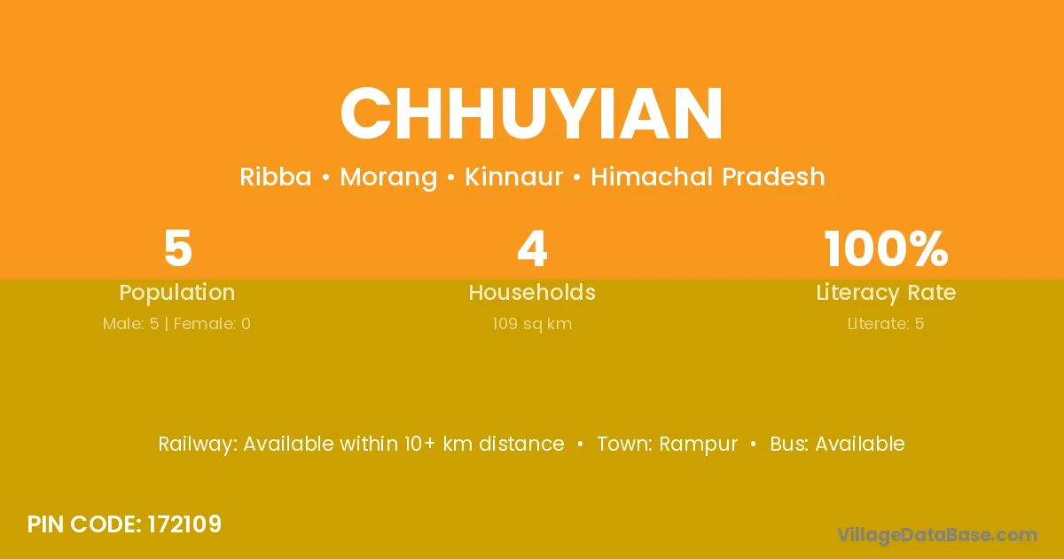 Chhuyian village has a total population of 5 people, of which 5 are males and 0 are females.