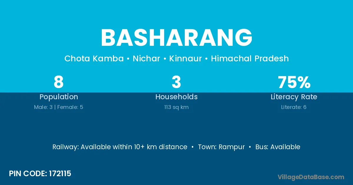 Basharang village has a total population of 8 people, of which 3 are males and 5 are females.