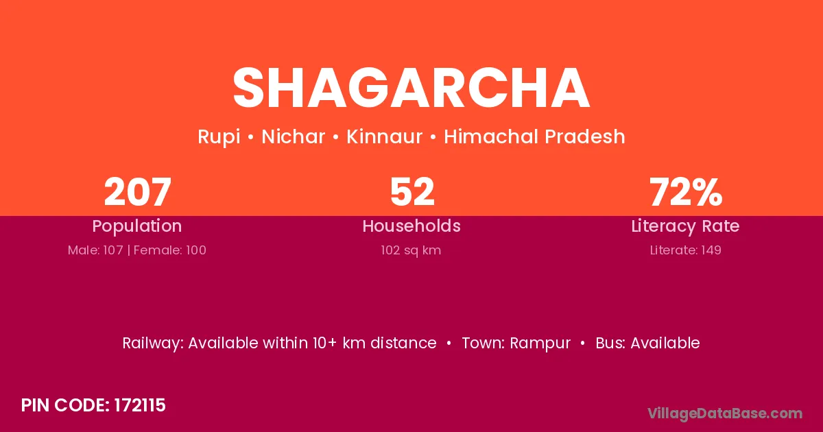 Shagarcha village has a total population of 207 people, of which 107 are males and 100 are females.