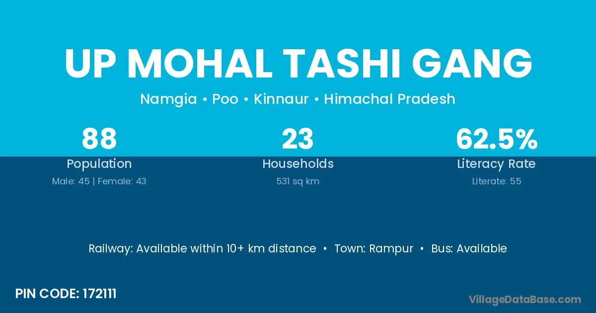 Up Mohal Tashi Gang village has a total population of 88 people, of which 45 are males and 43 are females.