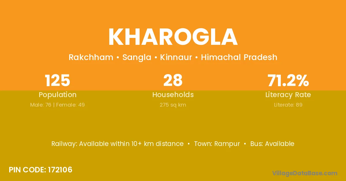 Kharogla village has a total population of 125 people, of which 76 are males and 49 are females.
