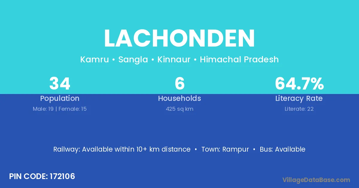 Lachonden village has a total population of 34 people, of which 19 are males and 15 are females.