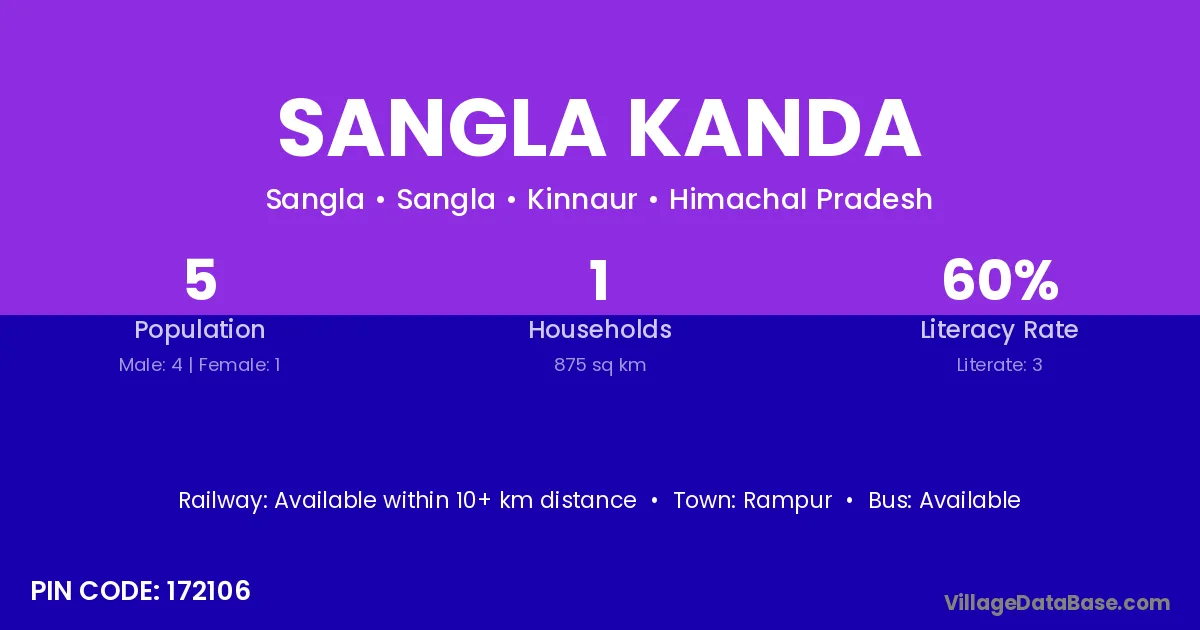 Sangla Kanda village has a total population of 5 people, of which 4 are males and 1 are females.