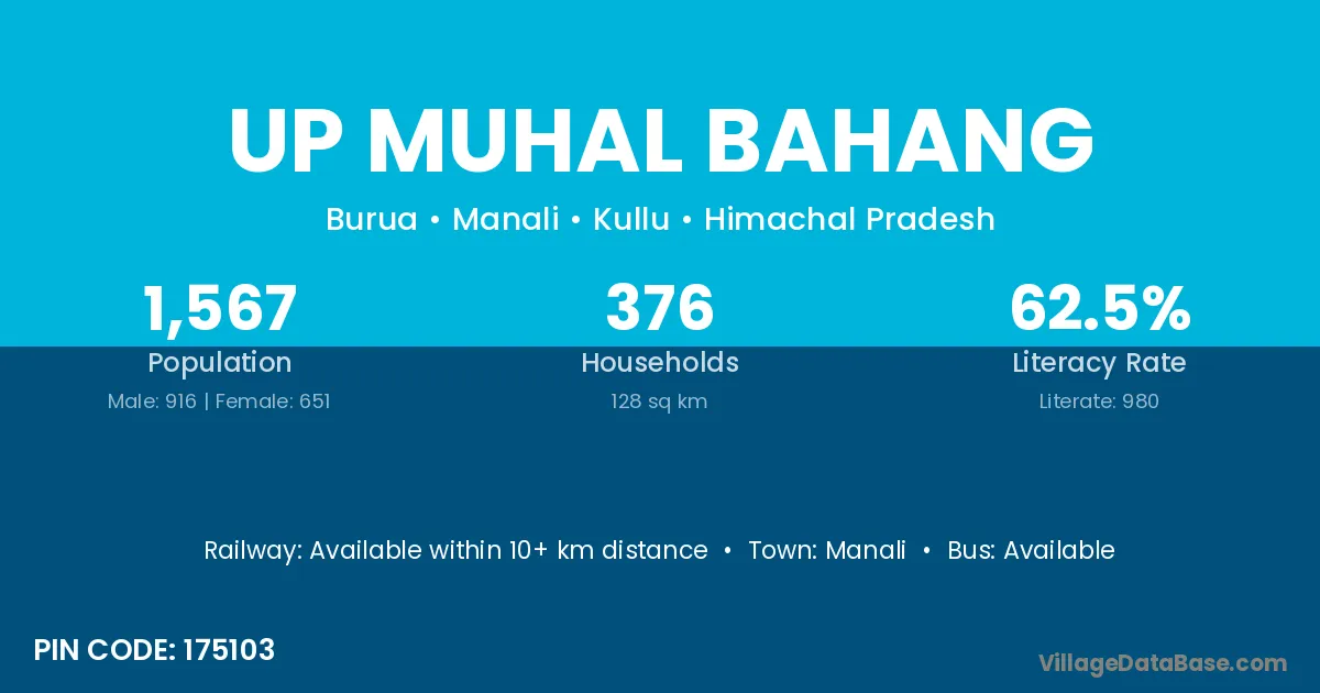 Up Muhal Bahang village has a total population of 1,567 people, of which 916 are males and 651 are females.