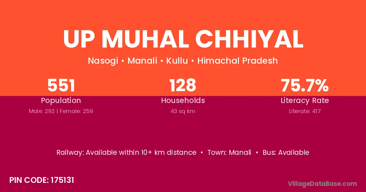 Up Muhal Chhiyal village has a total population of 551 people, of which 292 are males and 259 are females.