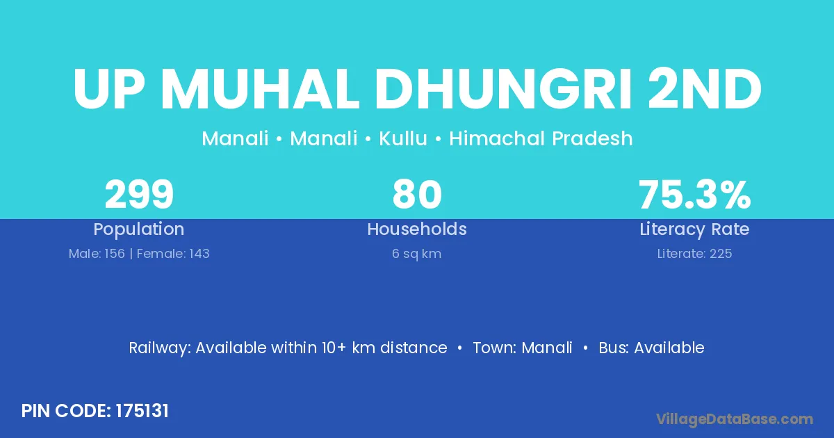 Up Muhal Dhungri 2nd village has a total population of 299 people, of which 156 are males and 143 are females.