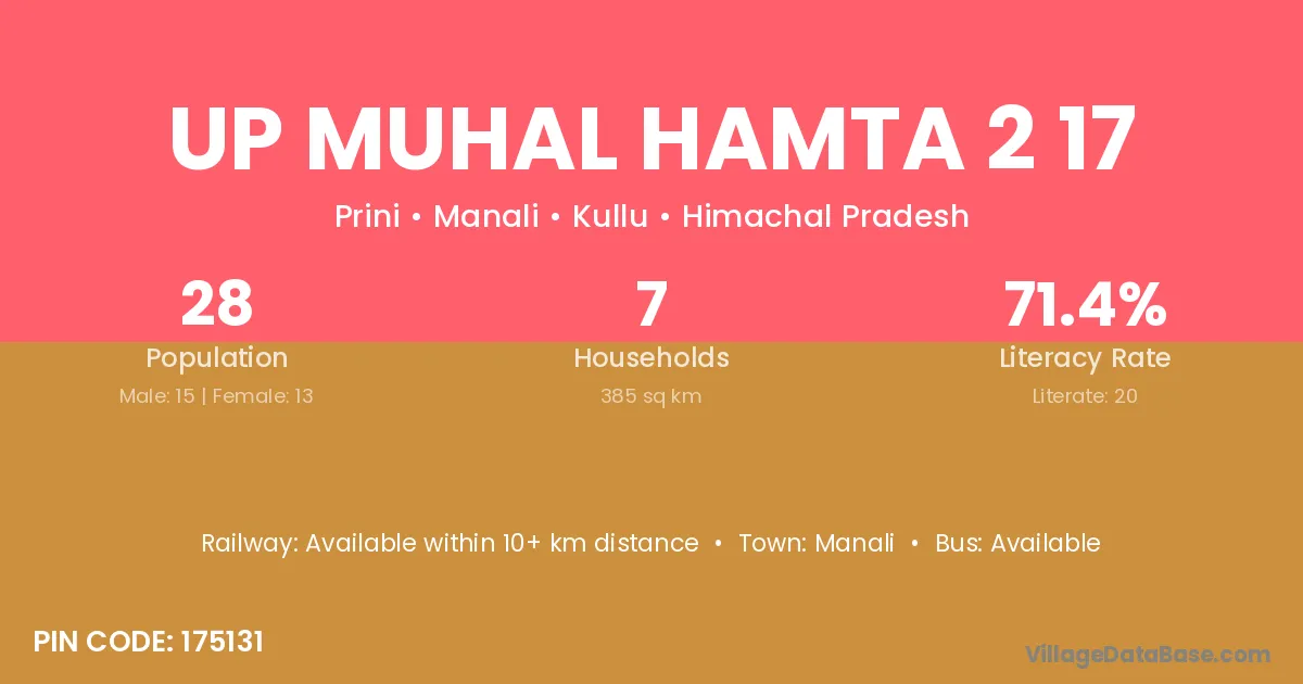 Manali is the nearest town to Up Muhal Hamta 2 17 village for major economic activities