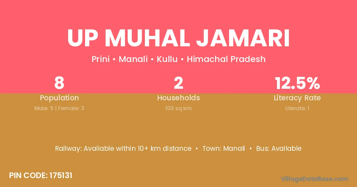Up Muhal Jamari village has a total population of 8 people, of which 5 are males and 3 are females.