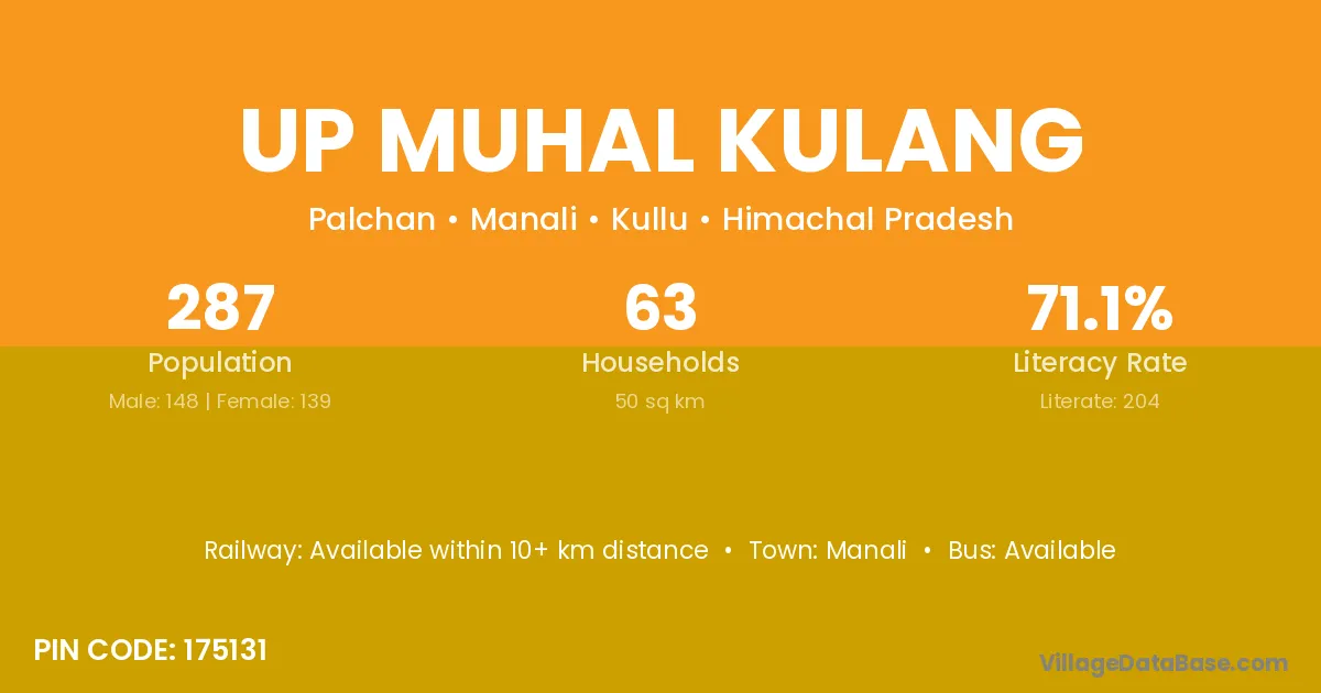 Up Muhal Kulang village has a total population of 287 people, of which 148 are males and 139 are females.