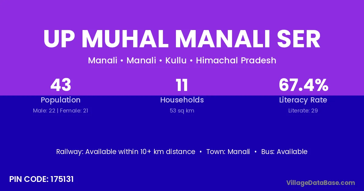 Up Muhal Manali Ser village has a total population of 43 people, of which 22 are males and 21 are females.