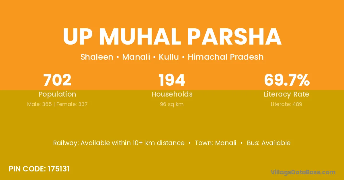 Up Muhal Parsha village has a total population of 702 people, of which 365 are males and 337 are females.