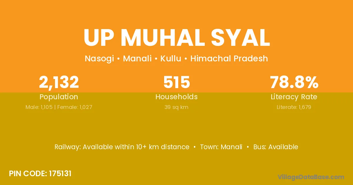 Up Muhal Syal village has a total population of 2,132 people, of which 1,105 are males and 1,027 are females.