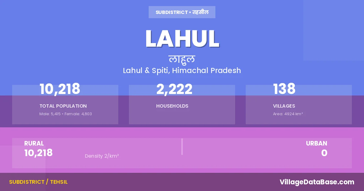 According to the 2011 census The total area of Lahul Tehsil is 4924 km², with a population of 10218 people. The population density is 2 inhabitants per square kilometre, and there are approximately 2222 houses in the sub district.