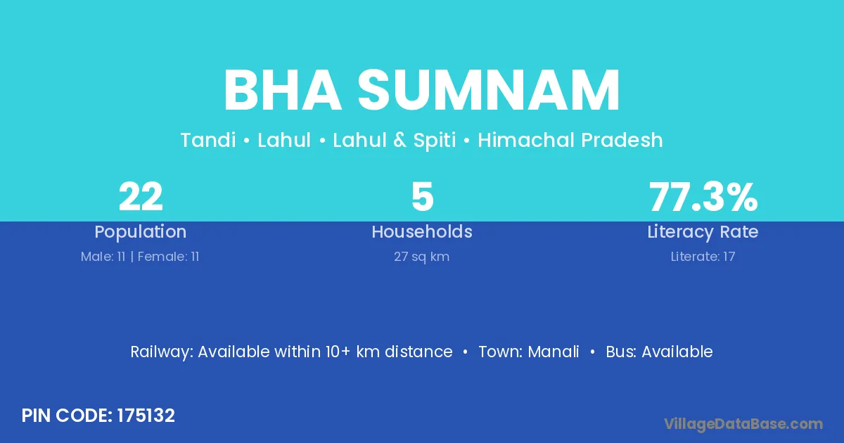 Bha Sumnam village has a total population of 22 people, of which 11 are males and 11 are females.