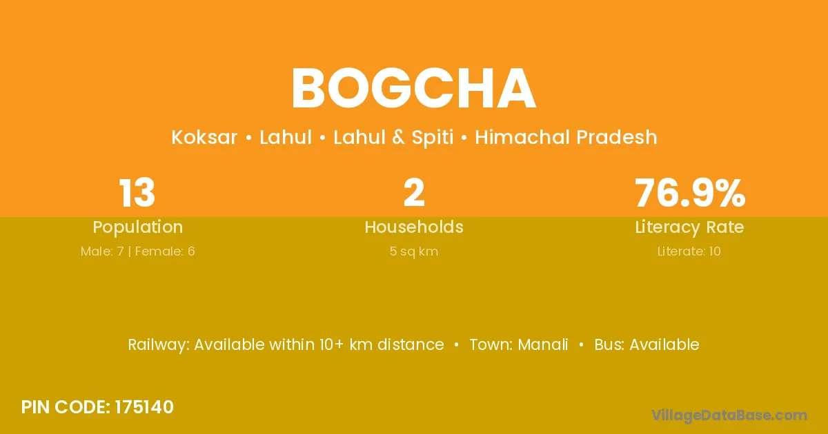 Bogcha village has a total population of 13 people, of which 7 are males and 6 are females.