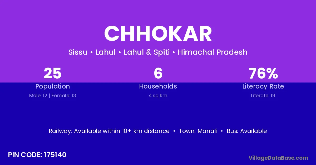 Chhokar village has a total population of 25 people, of which 12 are males and 13 are females.