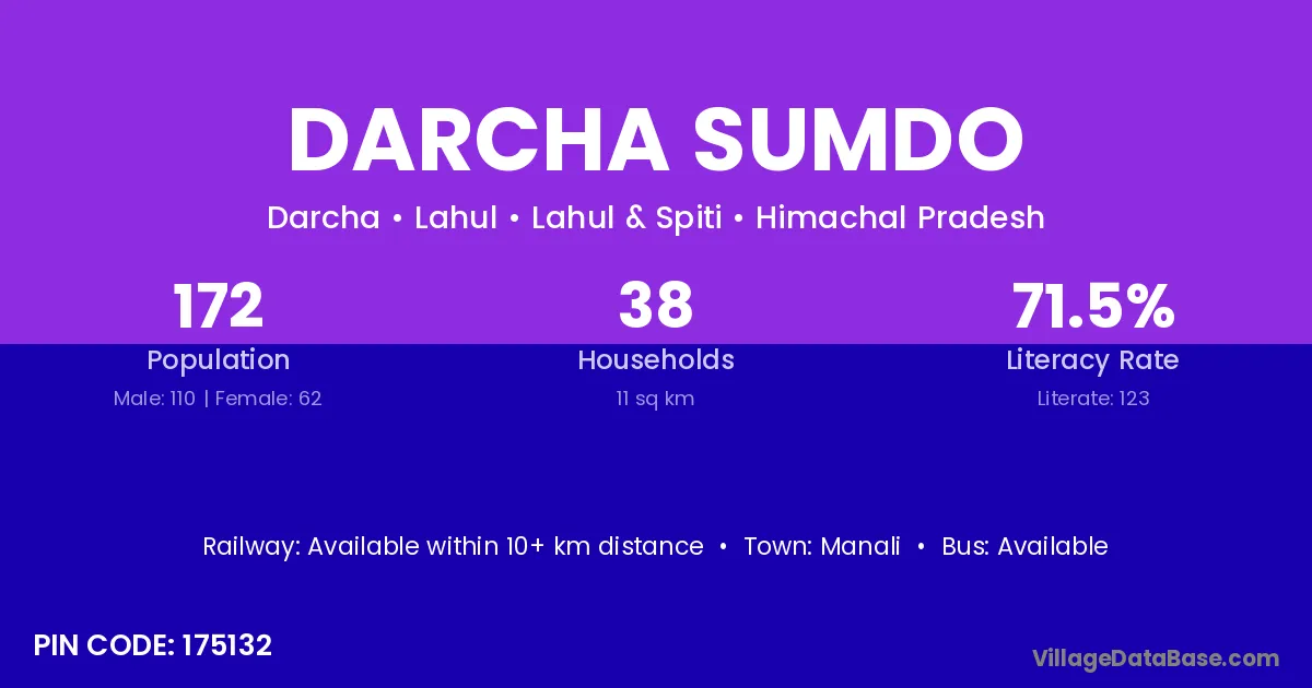 The literacy rate of Darcha Sumdo village is 71.51%. Male literacy stands at 86.36% and female literacy at 45.16%.