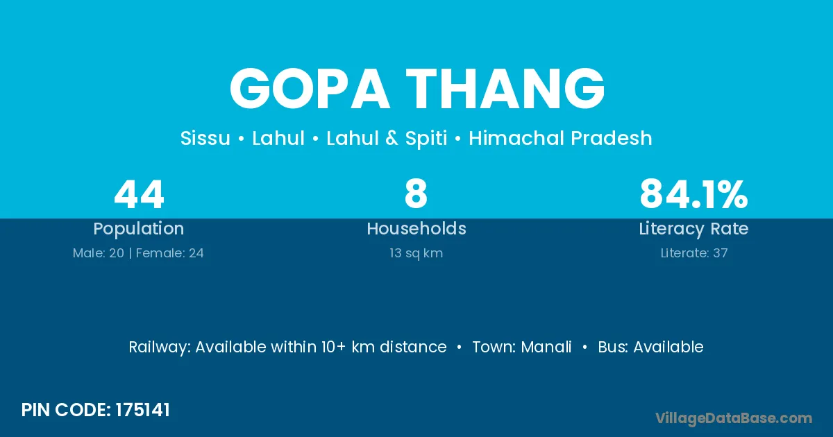 Gopa Thang village has a total population of 44 people, of which 20 are males and 24 are females.