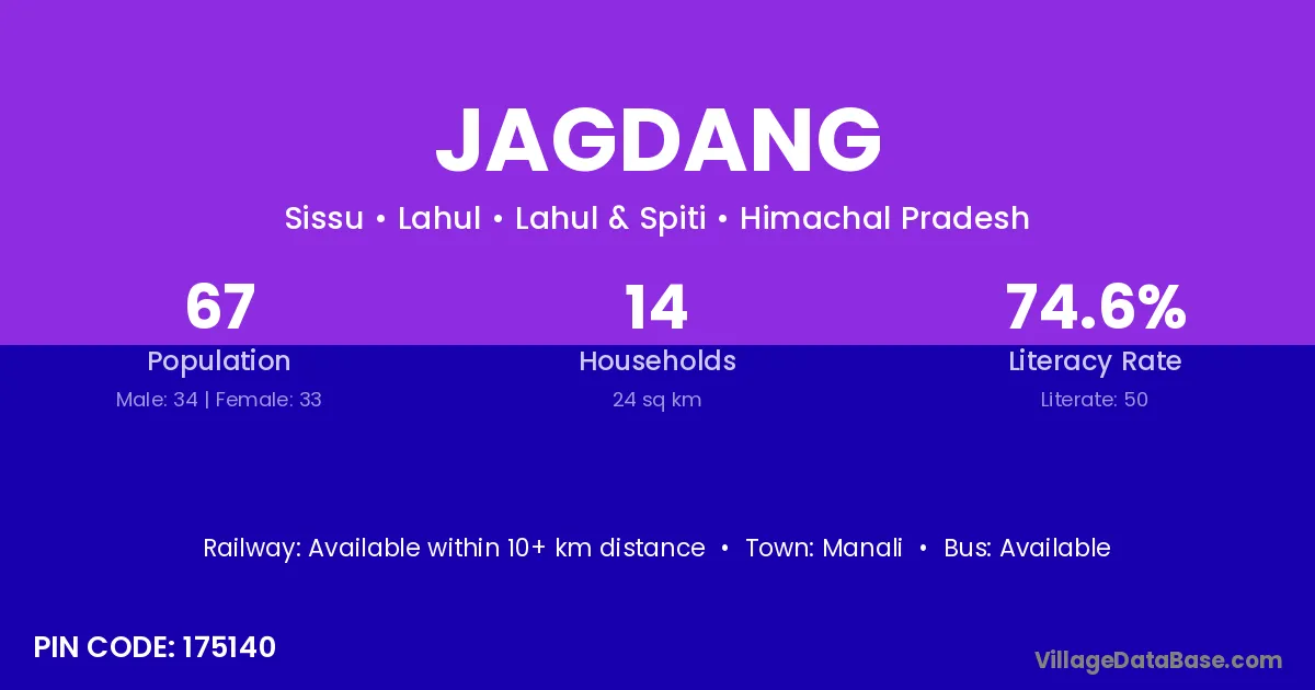 Jagdang village has a total population of 67 people, of which 34 are males and 33 are females.