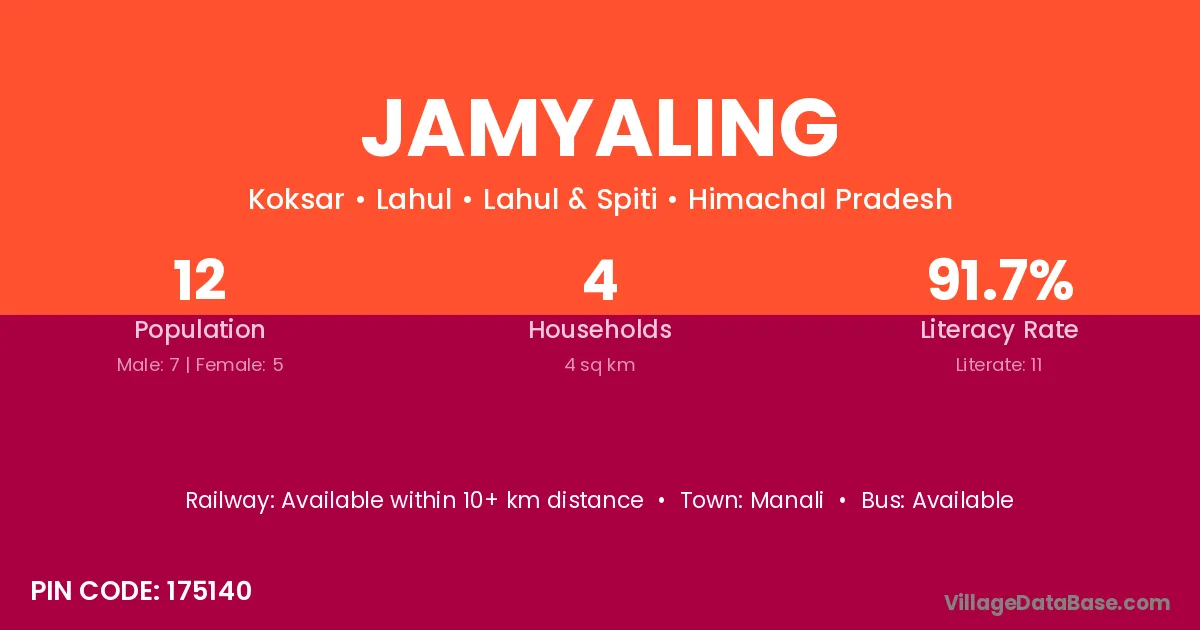 Jamyaling village has a total population of 12 people, of which 7 are males and 5 are females.