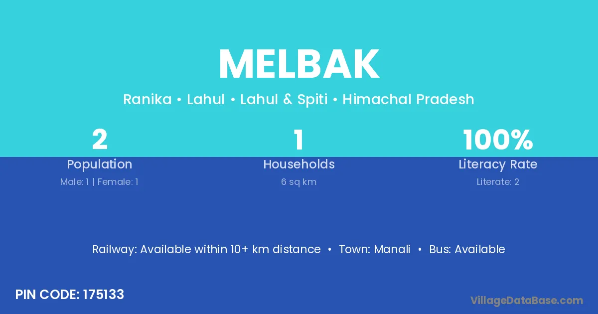 Melbak village has a total population of 2 people, of which 1 are males and 1 are females.