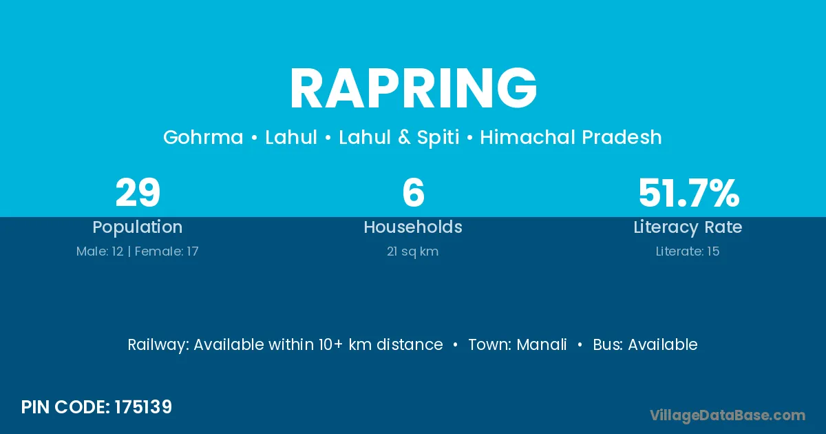Rapring village has a total population of 29 people, of which 12 are males and 17 are females.