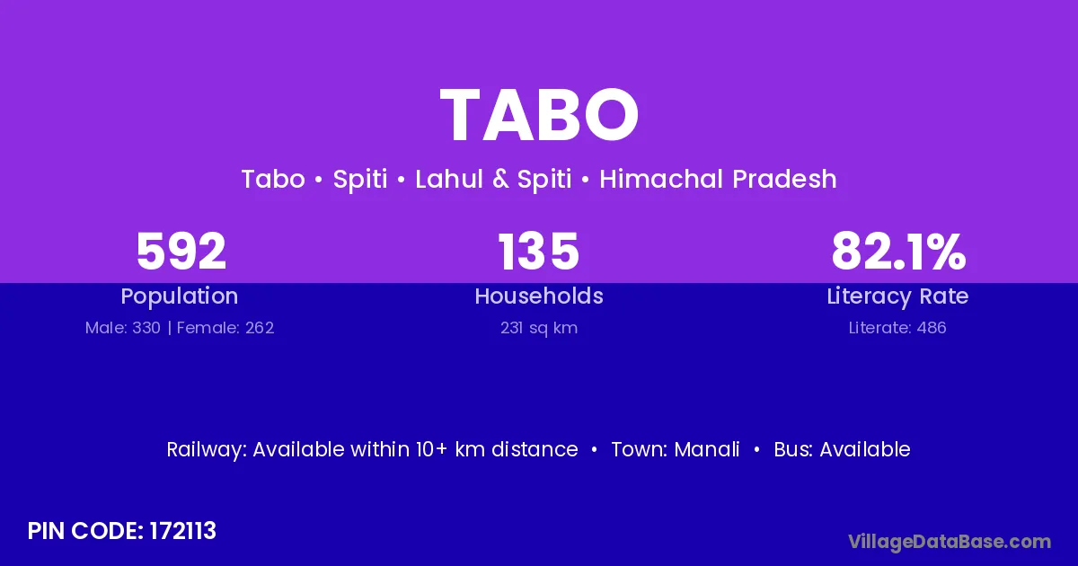 Tabo village has a total population of 592 people, of which 330 are males and 262 are females.
