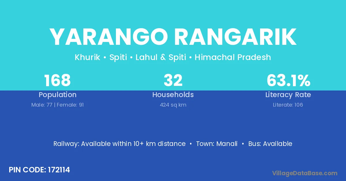 Manali is the nearest town to Yarango Rangarik village for major economic activities