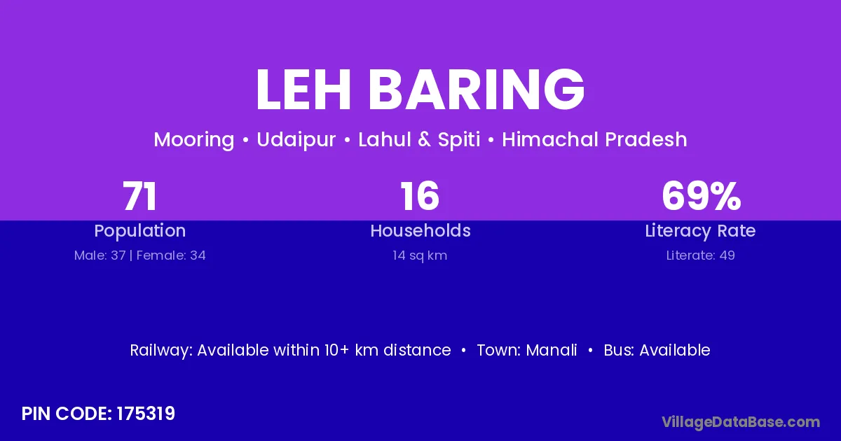 Leh Baring village has a total population of 71 people, of which 37 are males and 34 are females.