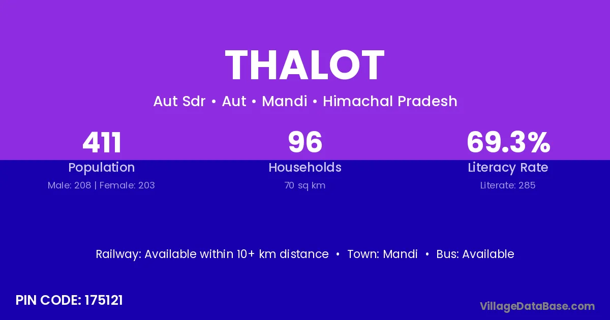 Thalot village has a total population of 411 people, of which 208 are males and 203 are females.