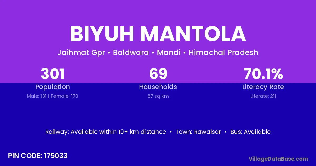 Biyuh Mantola village has a total population of 301 people, of which 131 are males and 170 are females.