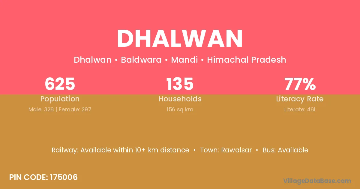 Dhalwan village has a total population of 625 people, of which 328 are males and 297 are females.