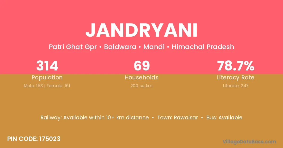 Jandryani village has a total population of 314 people, of which 153 are males and 161 are females.
