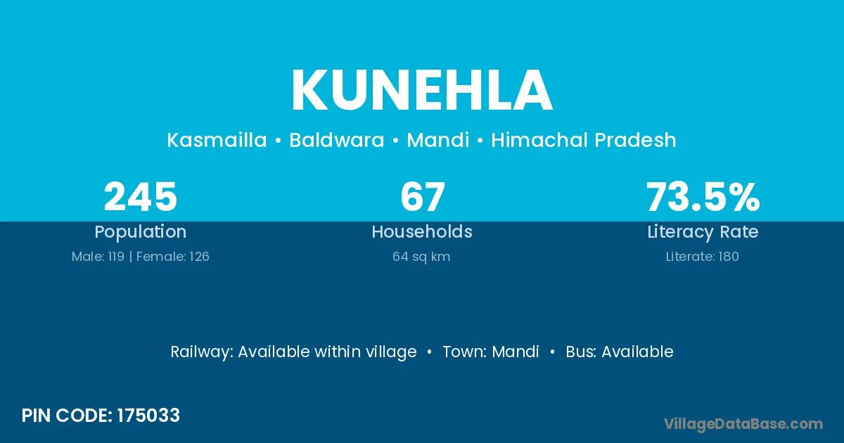 Kunehla village has a total population of 245 people, of which 119 are males and 126 are females.