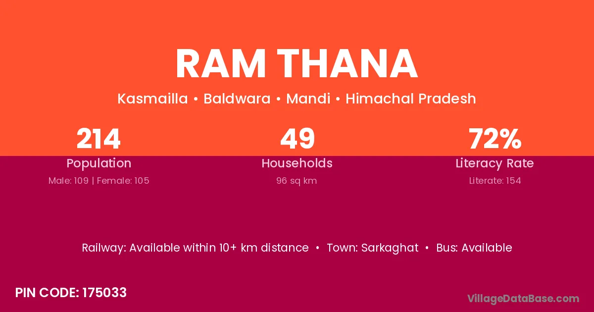 Ram Thana village has a total population of 214 people, of which 109 are males and 105 are females.