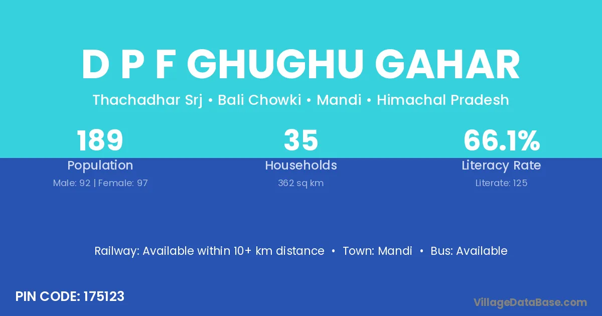 D P F Ghughu Gahar village has a total population of 189 people, of which 92 are males and 97 are females.