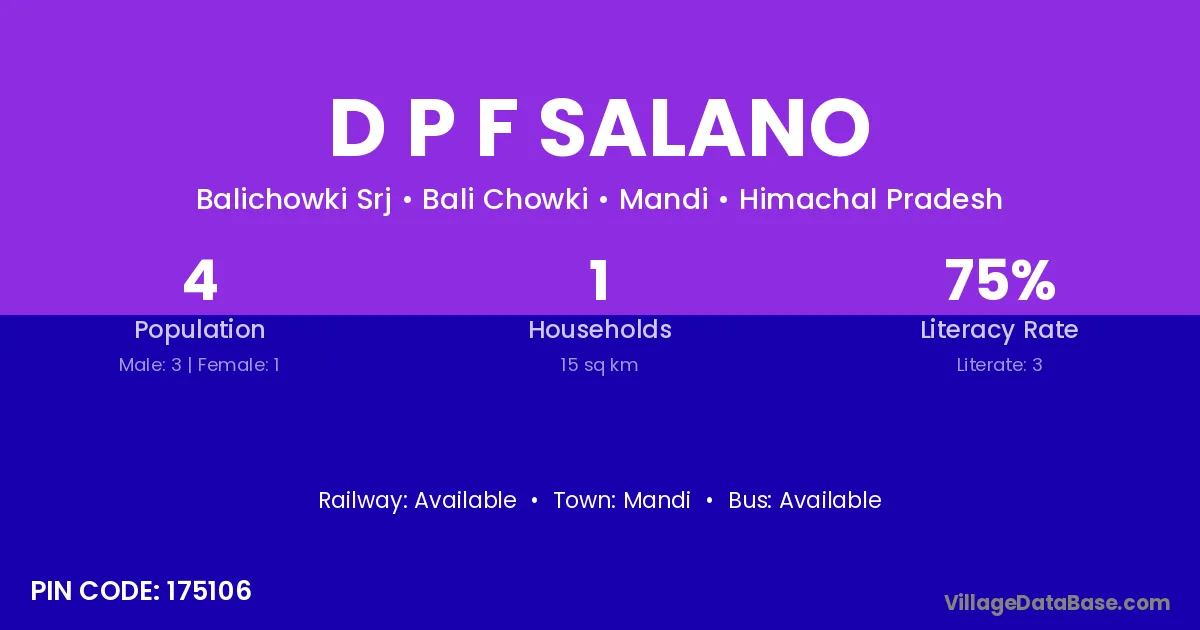 The literacy rate of D P F Salano village is 75.00%. Male literacy stands at 100.00% and female literacy at 0.00%.