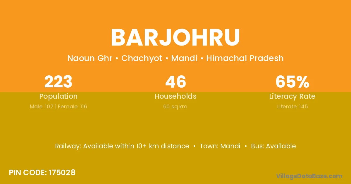 Barjohru village has a total population of 223 people, of which 107 are males and 116 are females.