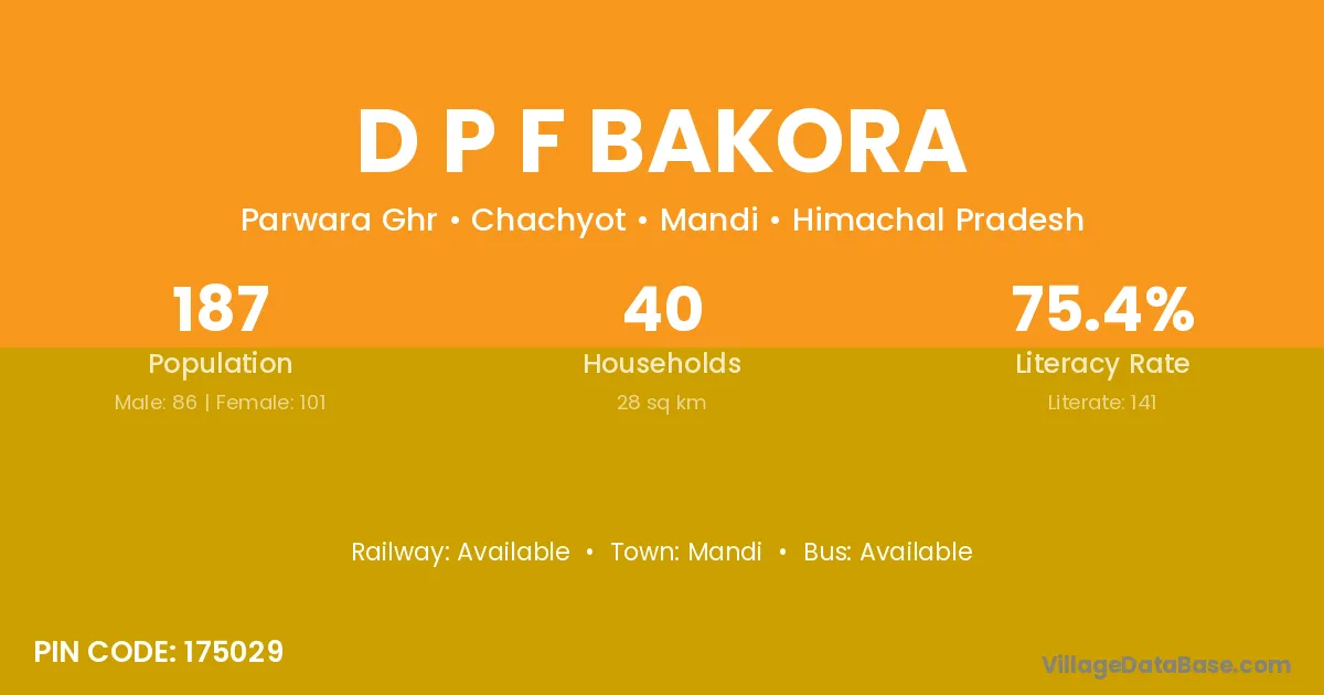 D P F Bakora village has a total population of 187 people, of which 86 are males and 101 are females.