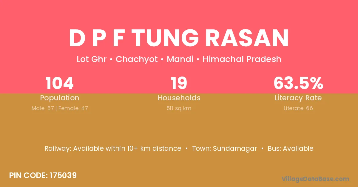 D P F Tung Rasan village has a total population of 104 people, of which 57 are males and 47 are females.