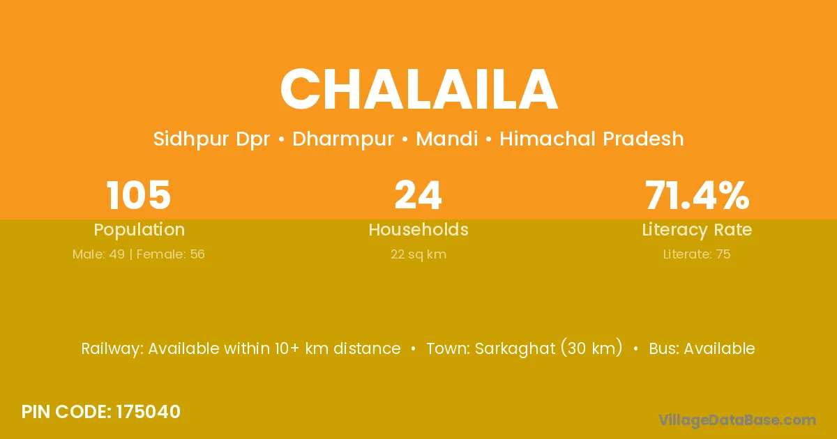 Sarkaghat (30 km) is the nearest town to Chalaila village for major economic activities and is located approximately 30 km away.